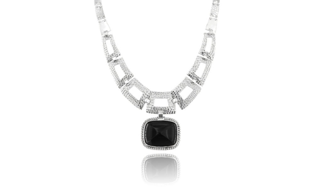 Our One of a Kind “Queen Necklace” handcrafted in Sterling Silver and Onyx gemstone. The Onyx stone is said to be a powerful warrior stone. A stone of protection, strength and grounding. This Necklace is an statement piece destined to leave a lasting impression.