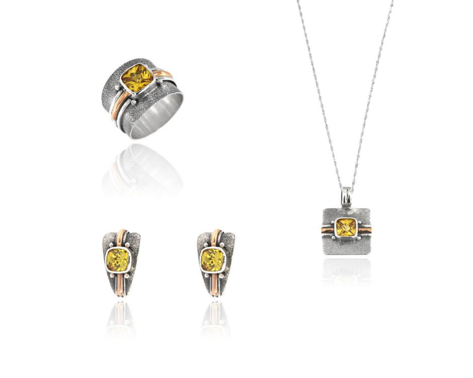 The 18k gold highlights transform even the simplest outfit into a gorgeous and put-together look. Each piece is available in stunning amethyst, topaz, or aquamarine.