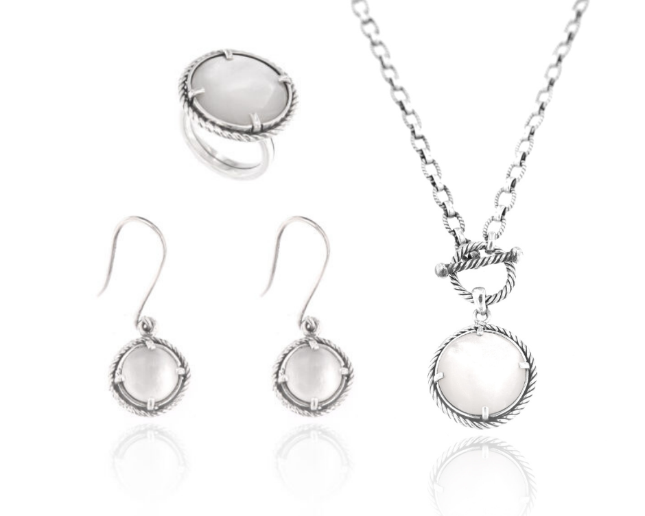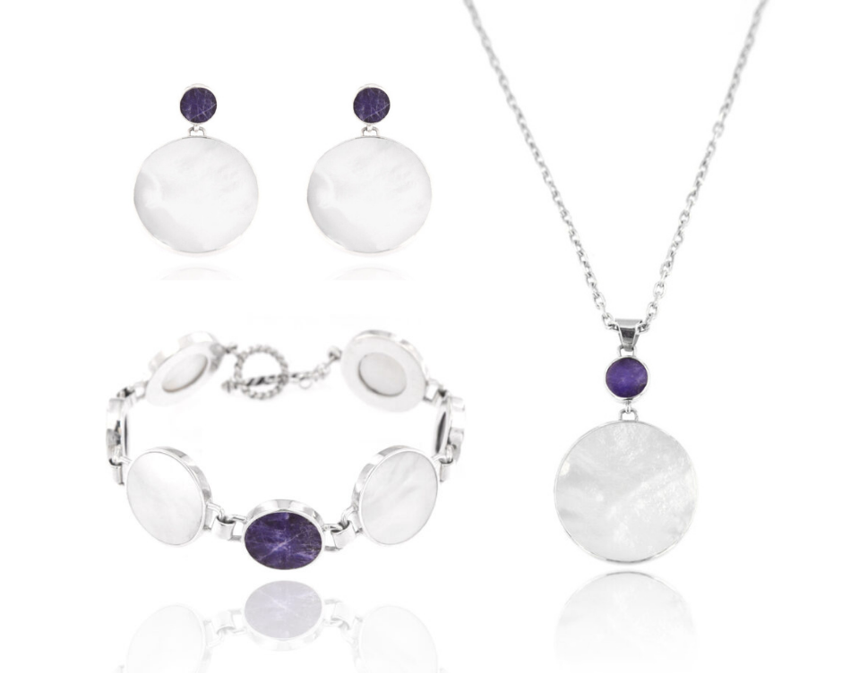 The Eclipse Set is gorgeous with Mother Of Pearl, Sodalite, and a classic shape. It all comes together for a bold look that you can style for day or night.