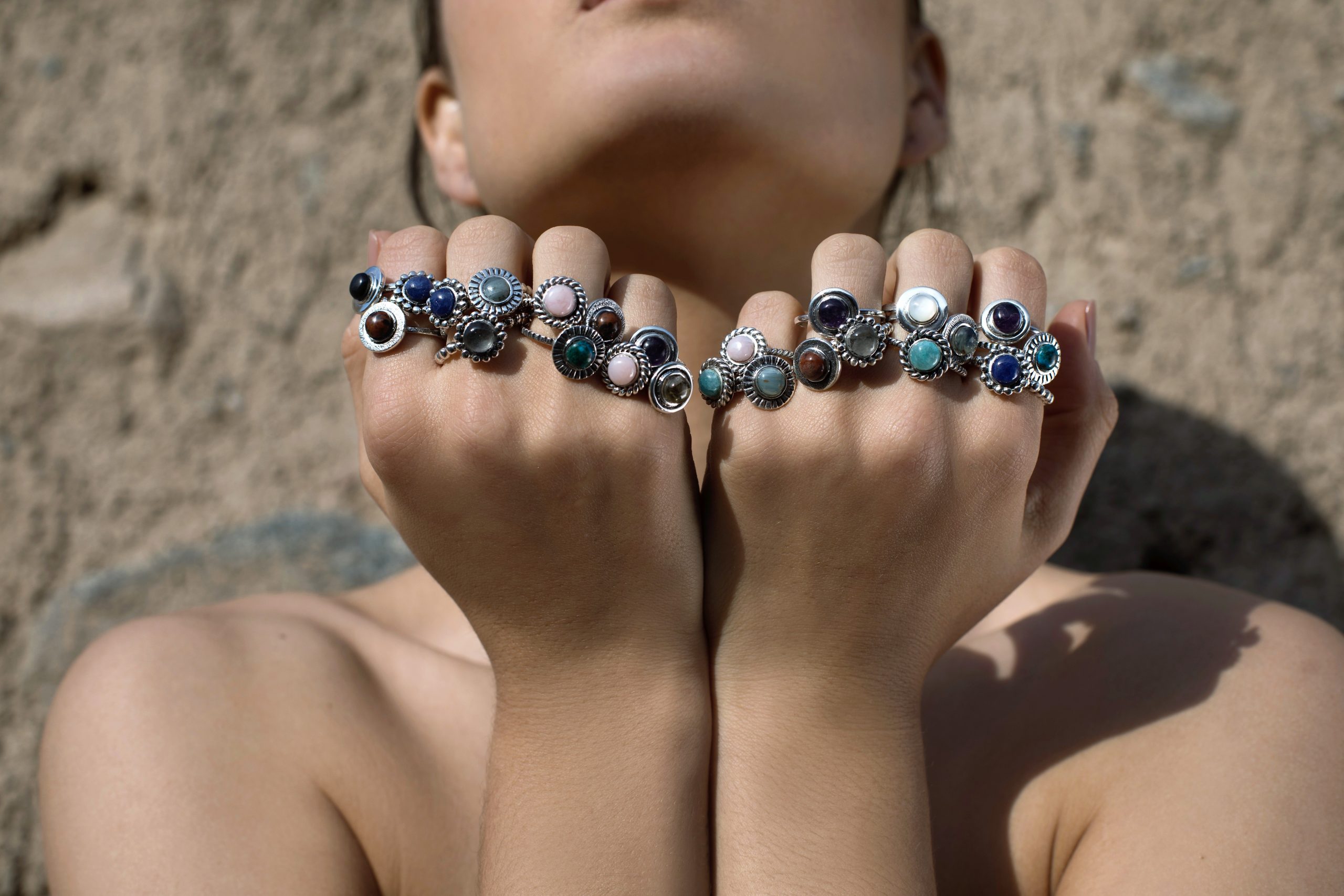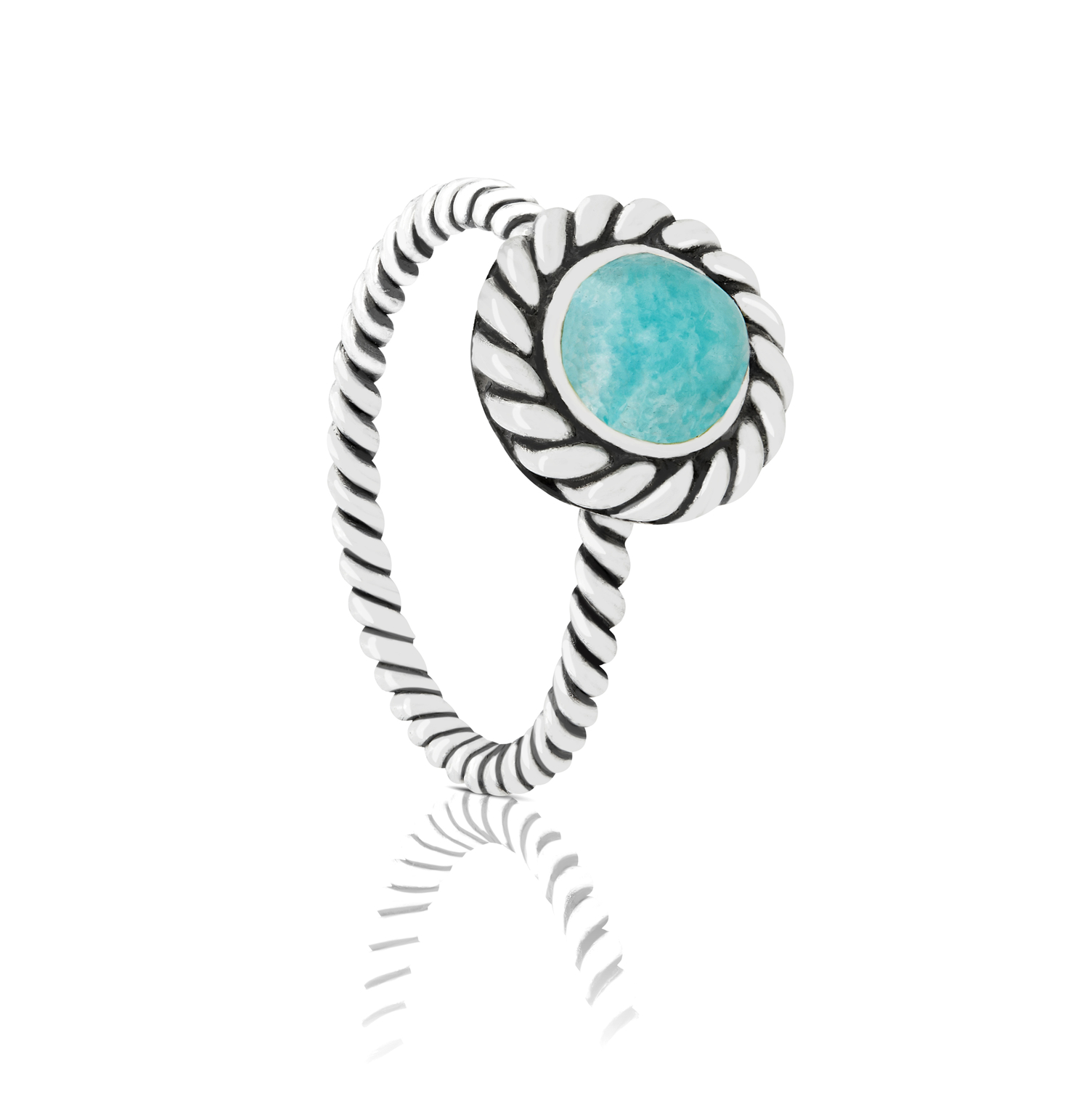 Handmade art jewelry, inspired by nature. These Sterling Silver Earth Stackable rings come in different shapes and meaningful gemstones, Mother of Pearl, Amazonite, Green Crysocola and Deep Blue Sodalite.