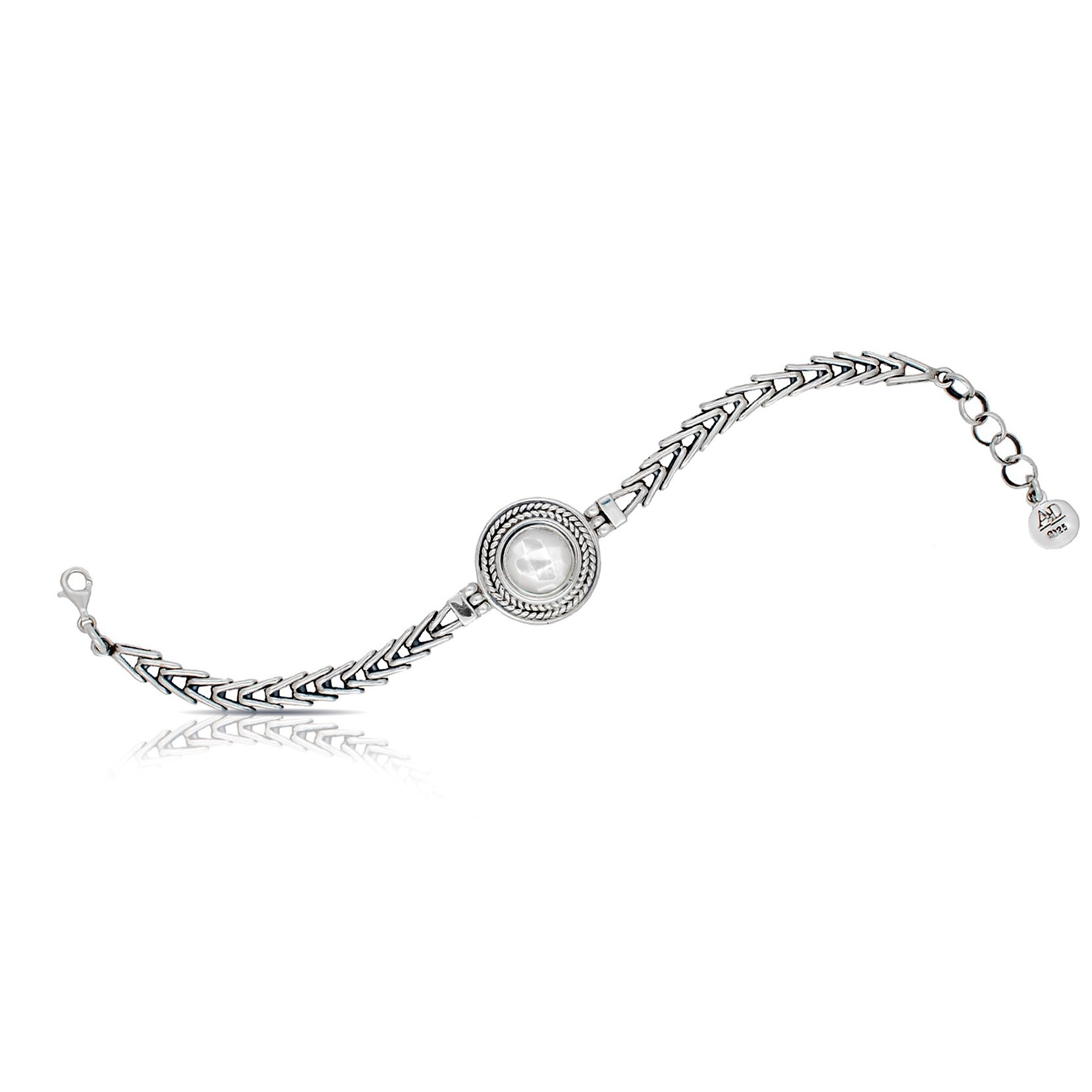 For this creation we used radiant round Mother of Pearl and Chrysocolla stones in the center of these stunning artisan-made Bracelets.