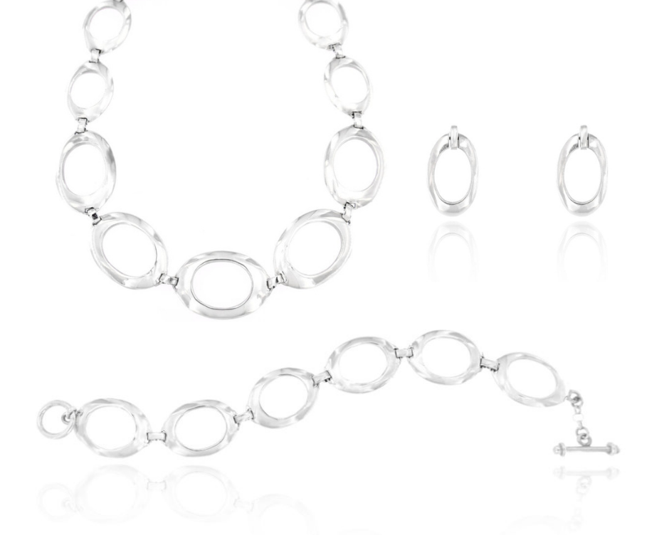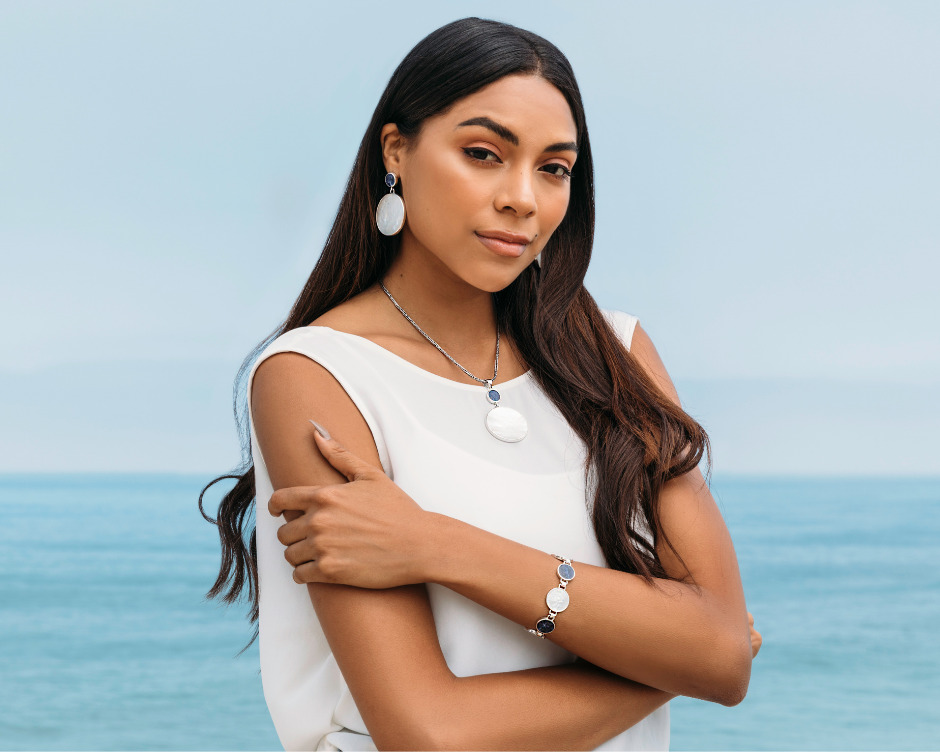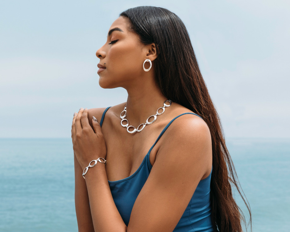 The matching Eclipse Pendant, Eclipse Earrings, and Eclipse Bracelet are must-haves for the bright beach days and exciting nights out on your summer vacation in Miami.