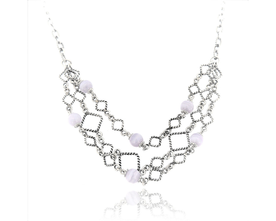 If you’re looking to make a big statement, check out our Syros Necklace. This necklace has been handcrafted in silver and features Chalcedony – a pale bluey-lilac stone that promotes calmness and ‘invokes a stillness of silent reverence’.
